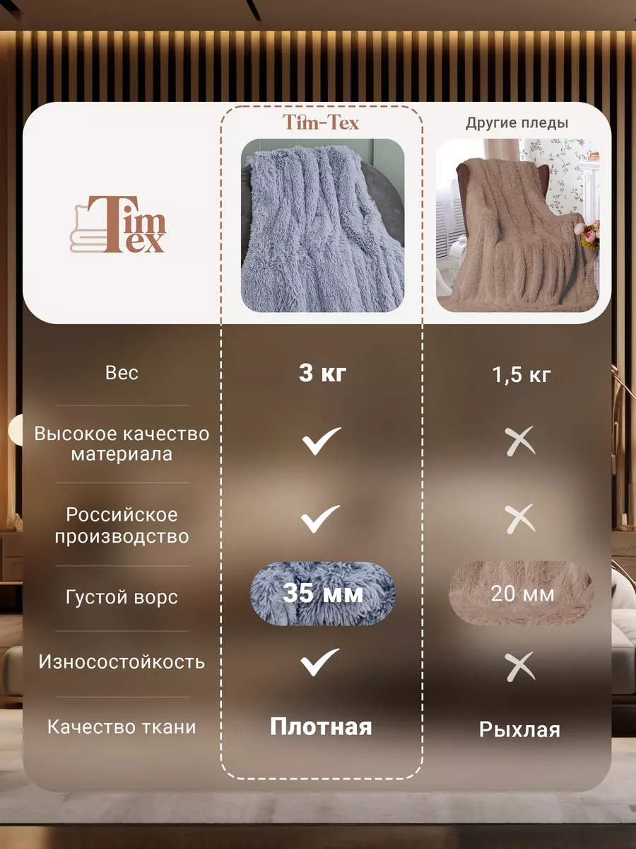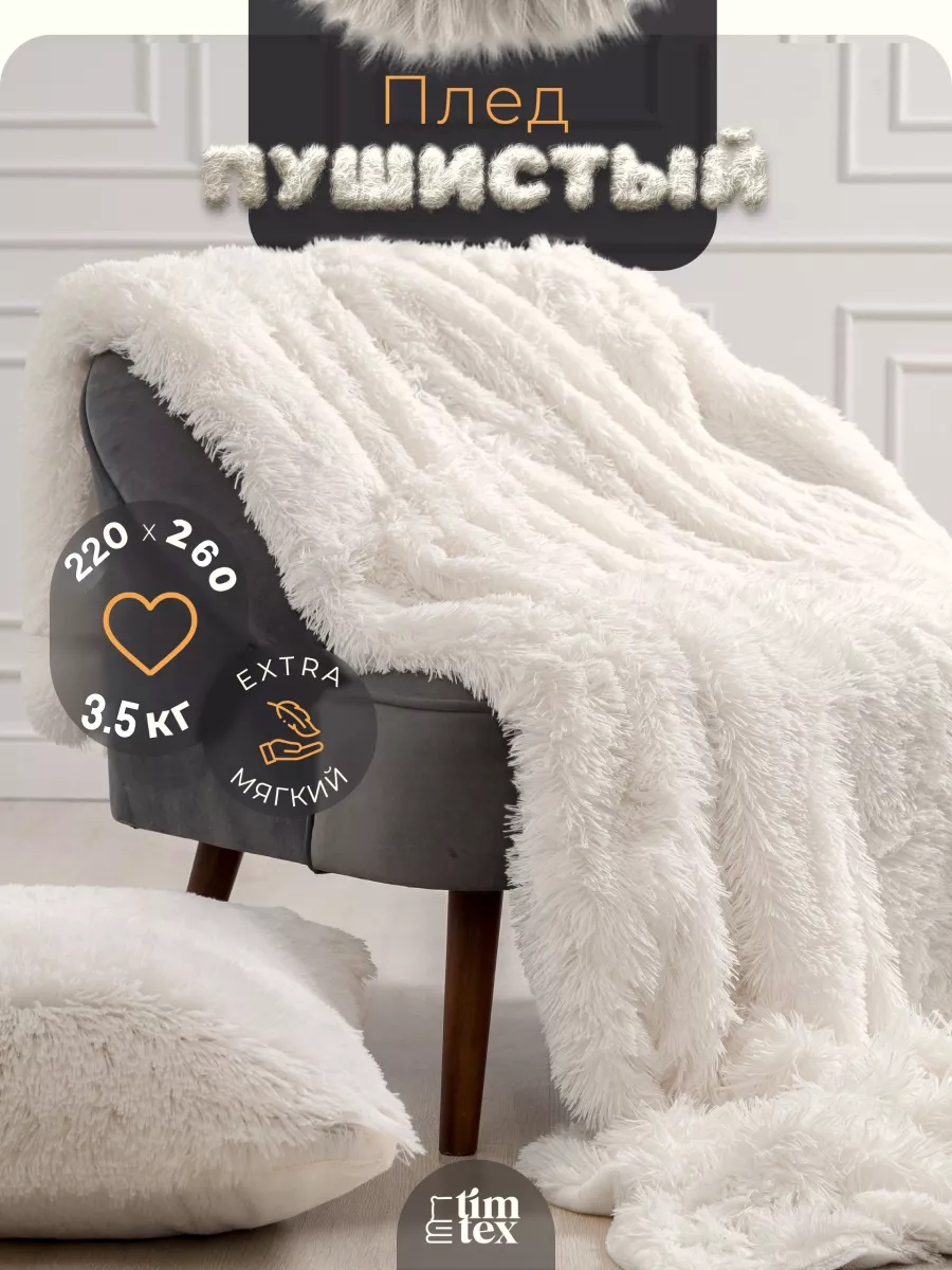 Плед TIM-TEX меховой 220х260 см для дома - это больше, чем просто плед на кровать или диван. Двусторонний пушистый плед из искусственного меха красиво дополняет интерьер, создавая атмосферу уюта в любом помещении. Будь то спальня, гостиная или детская комната. Особенно меховое покрывало на диван выручит холодными вечерами. Закутались в мягкий плед и забыли о холоде, а также обо всех проблемах. Ведь мягкий шерстяной плед на кровать моментально согревает, расслабляет и дарит уют. Также в нашем ассортименте представлен плед 200х220 см. Плед травка с длинным пушистым ворсом (длина: 4 см, плотность: 540 гр/м²) очень мягкий и приятный к телу. Такие материалы, как флис и велюр, гипоаллергенные, поэтому плед можно использовать, как маленький детский плед для малыша. Дети оценят то, какой наш плюшевый плед для мальчика или девочки милый и нежный. Под пледом очень приятно спать. Но его удобно использовать не только как одеяло, но и как покрывало для кровати, декоративную накидку на диван, в том числе угловой, или кресло. При этом наши пледы евро совсем некапризные в уходе.